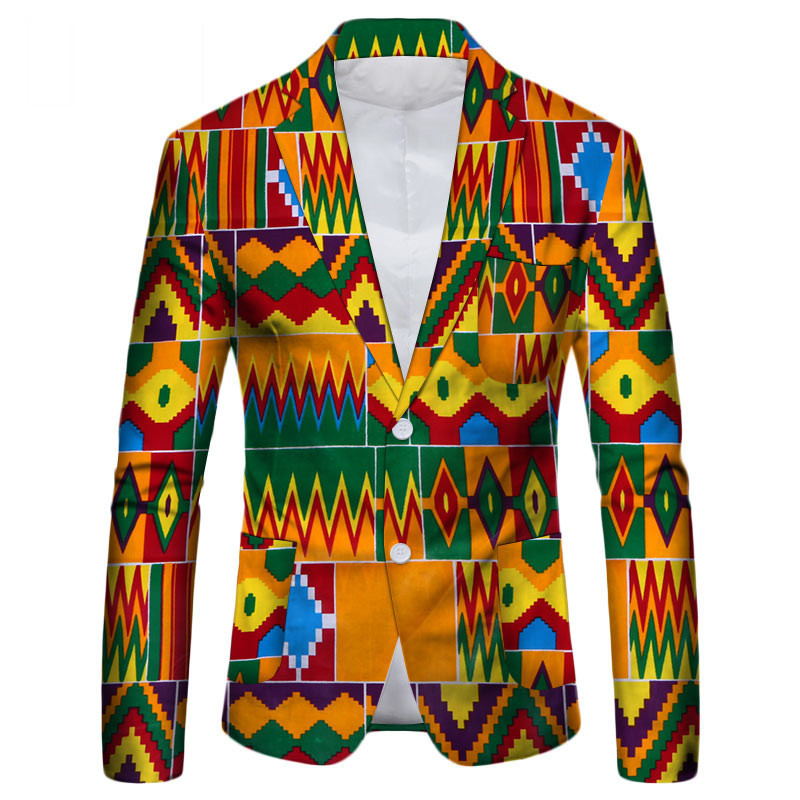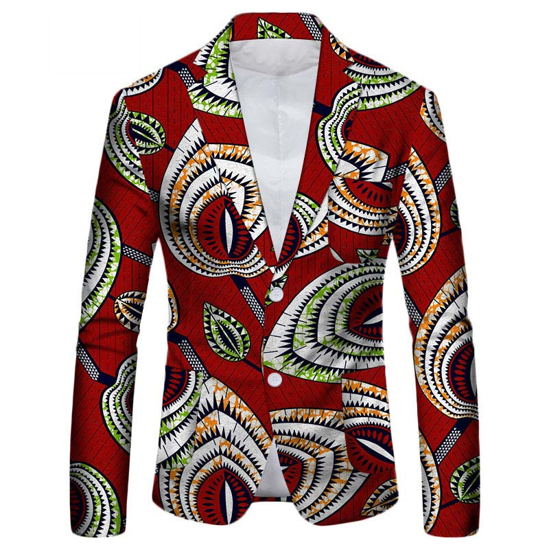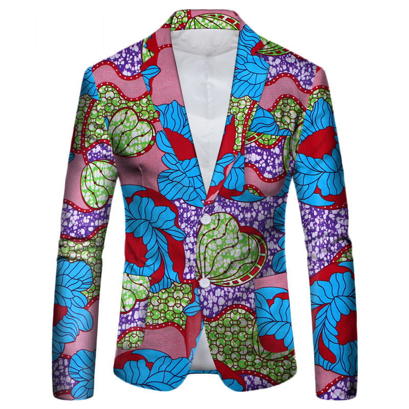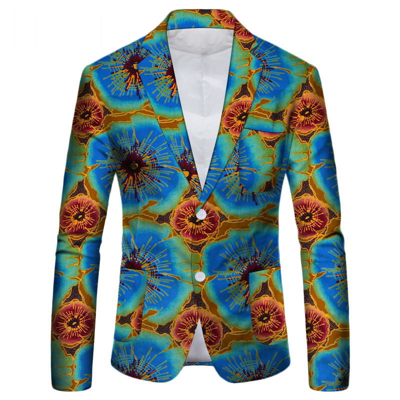 2.This suit jacket breaks from the traditional single color and uses African batik fabrics with rich colors and diverse patterns, making the upper body more youthful and energetic.This fancy suit jacket has a lapel design and two white buttons on the abdomen, which are easy to put on and take off and add highlights to the whole jacket. The smooth arc of the hem of the suit jacket fully demonstrates the high quality and exquisite craftsmanship.