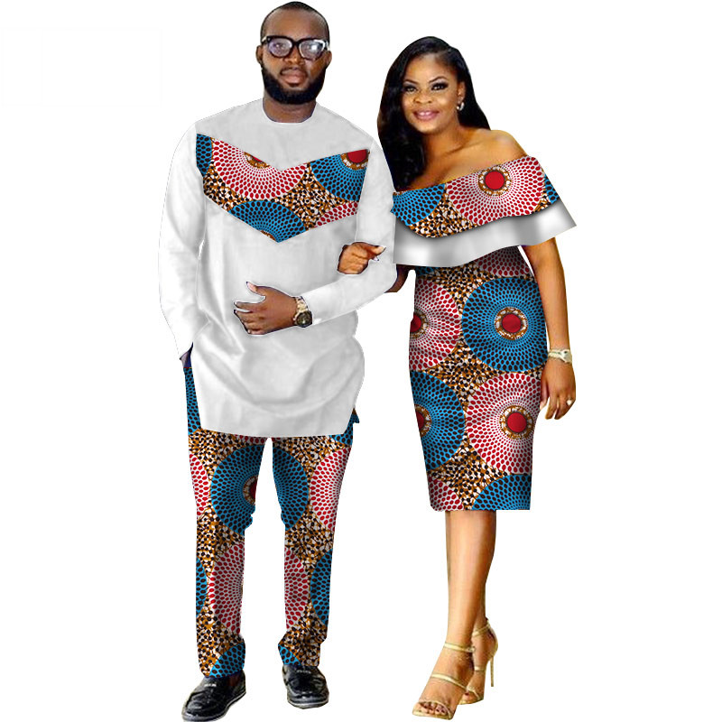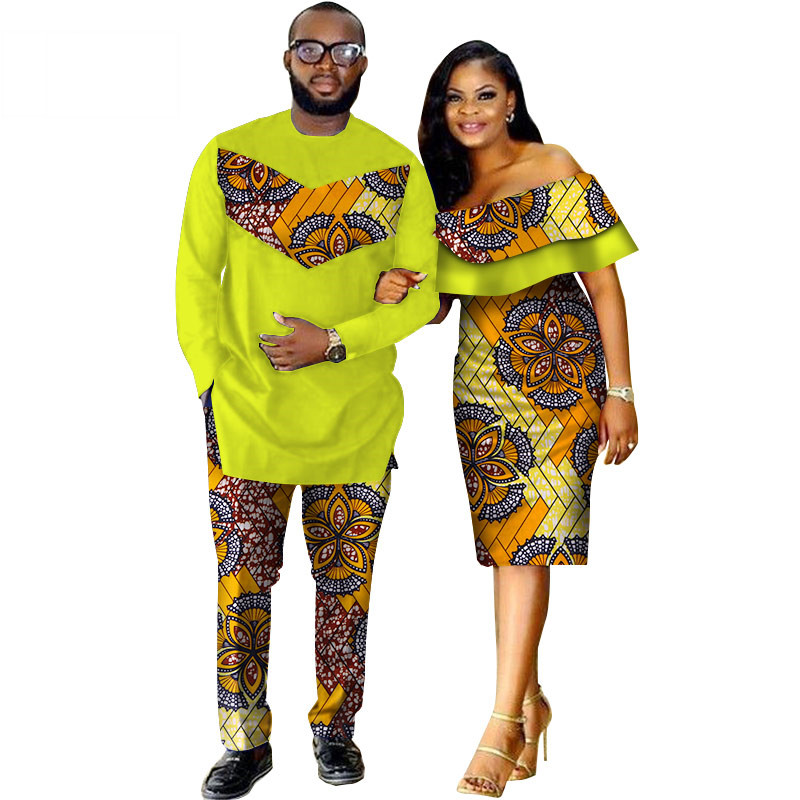 African Clothing for Lovers Men Top Pant Set and Women Ruffle Sleeve Dress WYQ62