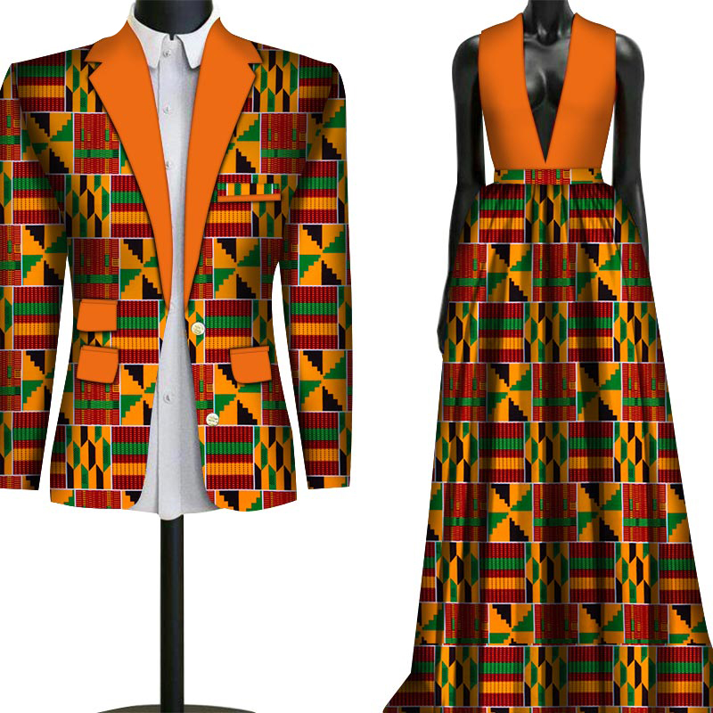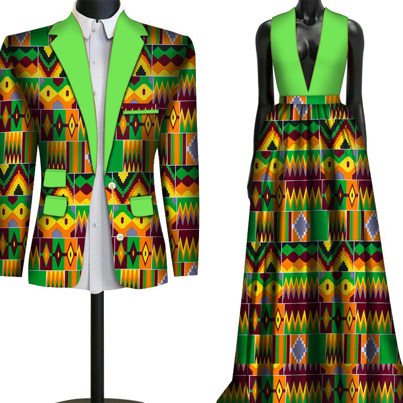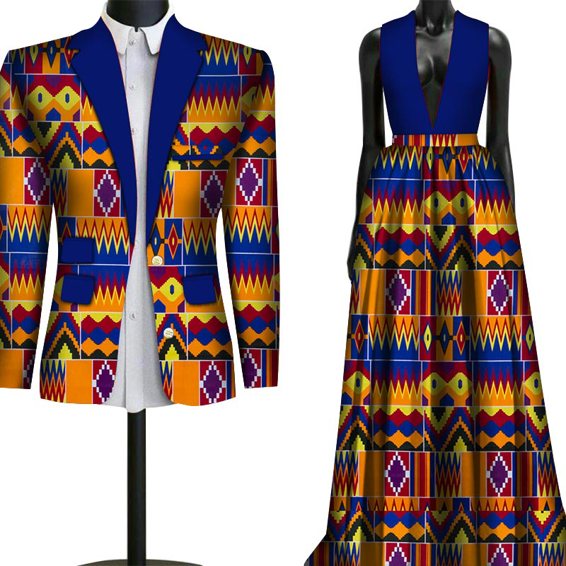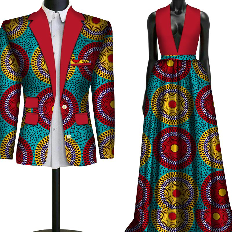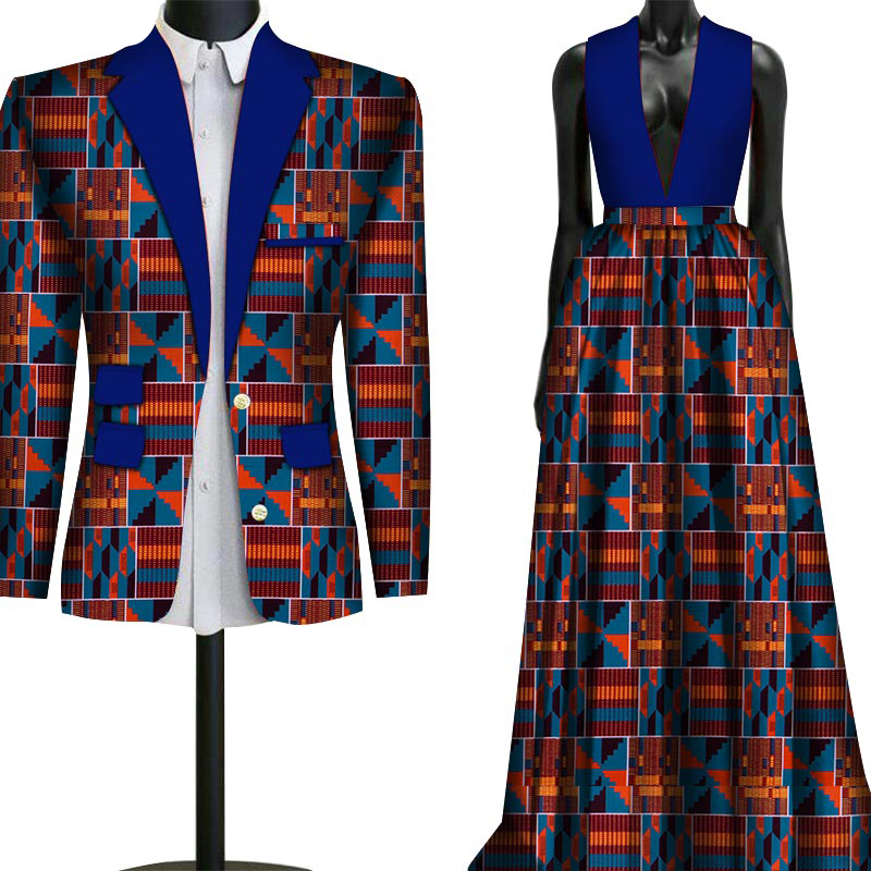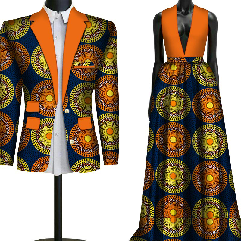 2 Piece Set Wedding Couple Clothing African Print Dashiki for Lovers Men’s Suit Blazer Plus Women’s Party Long Dress WYQ79